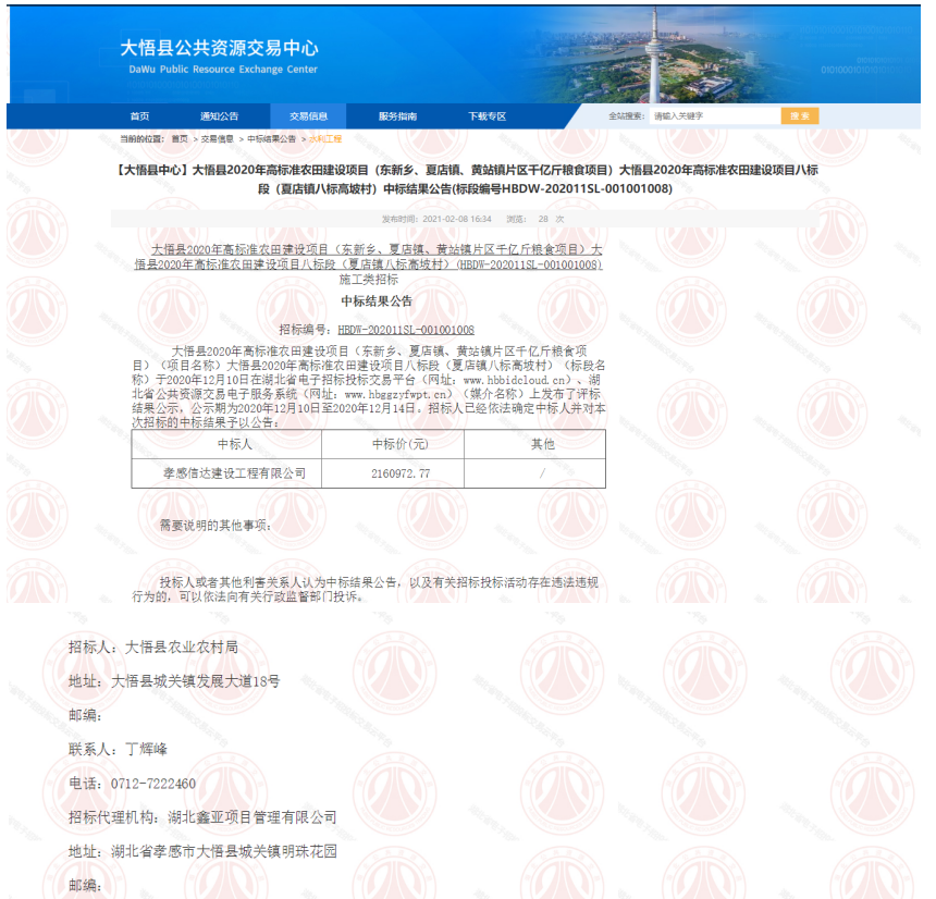 項目名稱:大悟縣2020年高標準農田建設項目八標段(夏店鎮八標高坡村)http://www.hbbidcloud.com/dawu/jyxx/004005/004005002/20210208/21236970-9908-4285-a6e9-278eff845009.html項目法人:大悟縣農業農村局中標.........