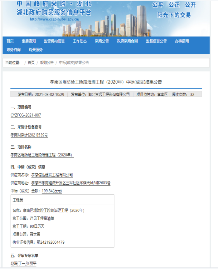 項目名稱:孝南區堤防險工險段治理工程(2020年)http://www.ccgp-hubei.gov.cn/notice/202103/notice_3c51e011ab2644e38b3a73c1916b5770.html項目法人:孝感市堤防管理總段中標金額:199.84萬元......