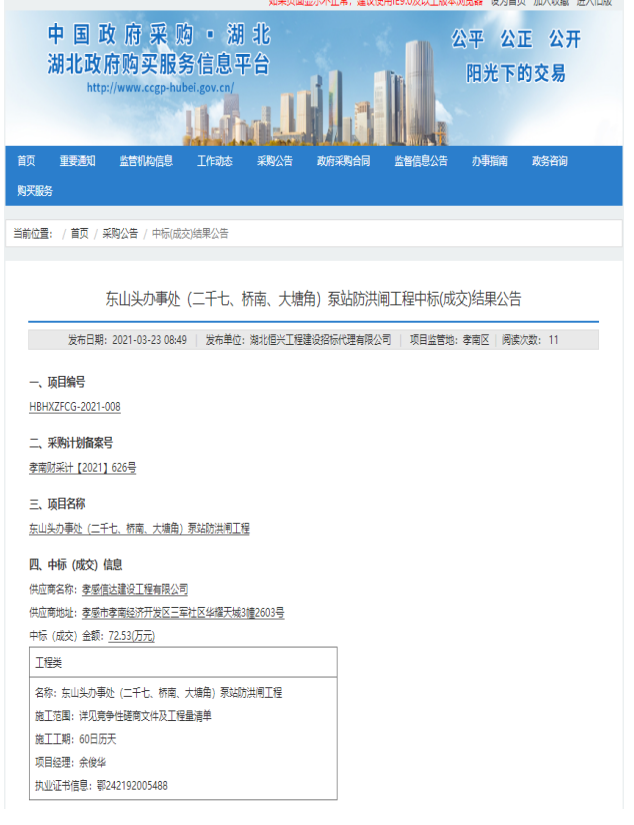 項目名稱:東山頭辦事處(二千七、橋南、大塘角)泵站防洪閘工程http://www.ccgp-hubei.gov.cn/notice/202103/notice_36c8cbc768664467a4519f9d0ffbe0fd.html項目法人:孝南區東山頭辦事處中標金額:72.53萬元.........