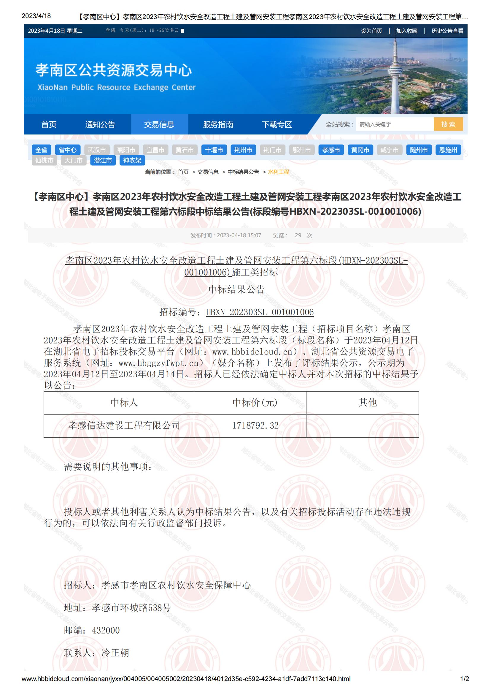 項目名稱:孝南區2023年農村飲水安全改造工程土建及管網安裝工程第六標段...