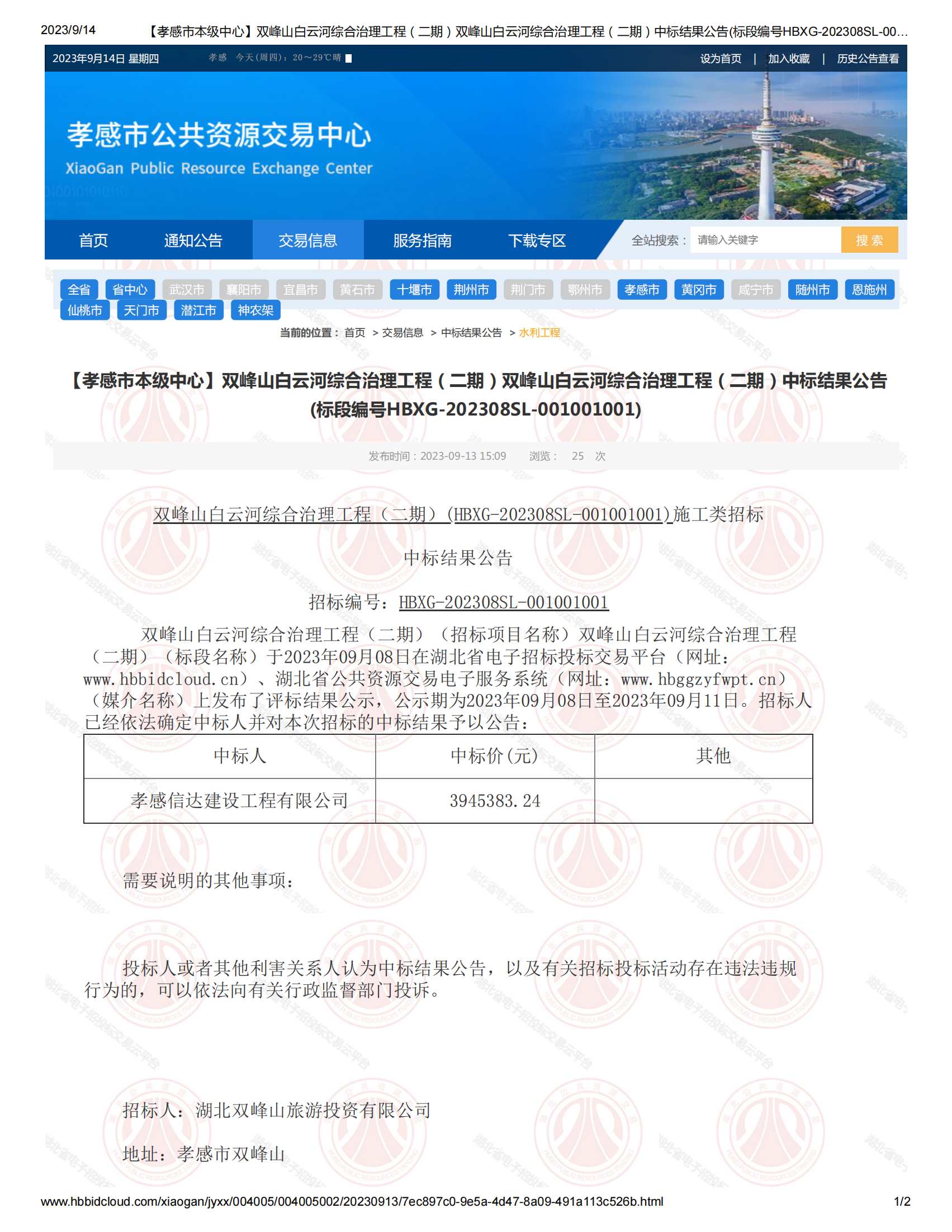 項目名稱:雙峰山白云河綜合治理工程(二期)...