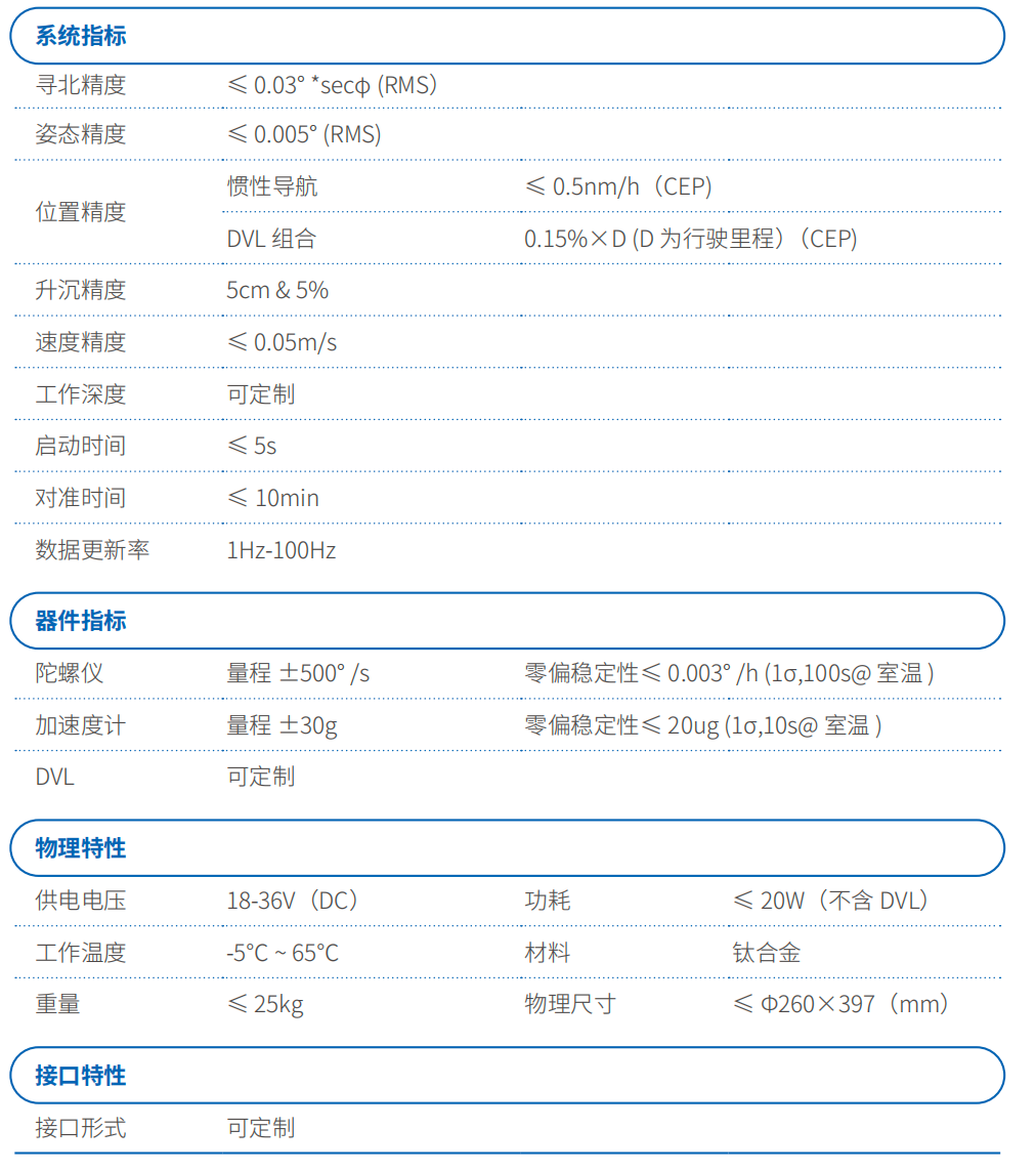 F990SD 是一款自主研發(fā)的精度高一體式耐壓光纖慣性導(dǎo)航系統(tǒng),可實現(xiàn) 0.03°的自尋北, DVL 組合導(dǎo)航精度可達(dá) 0.15 %*D。
